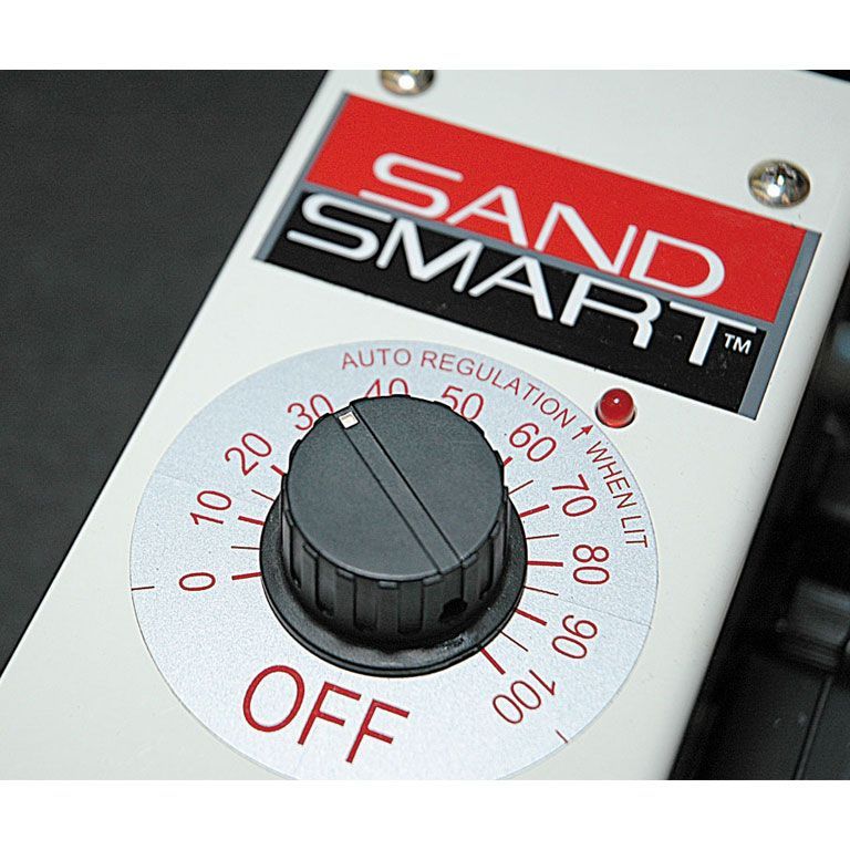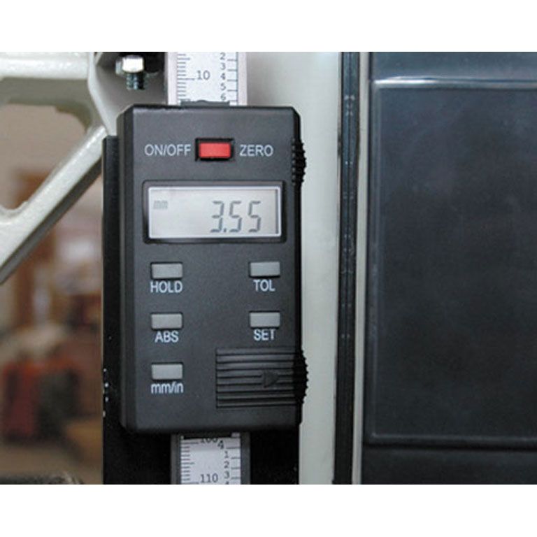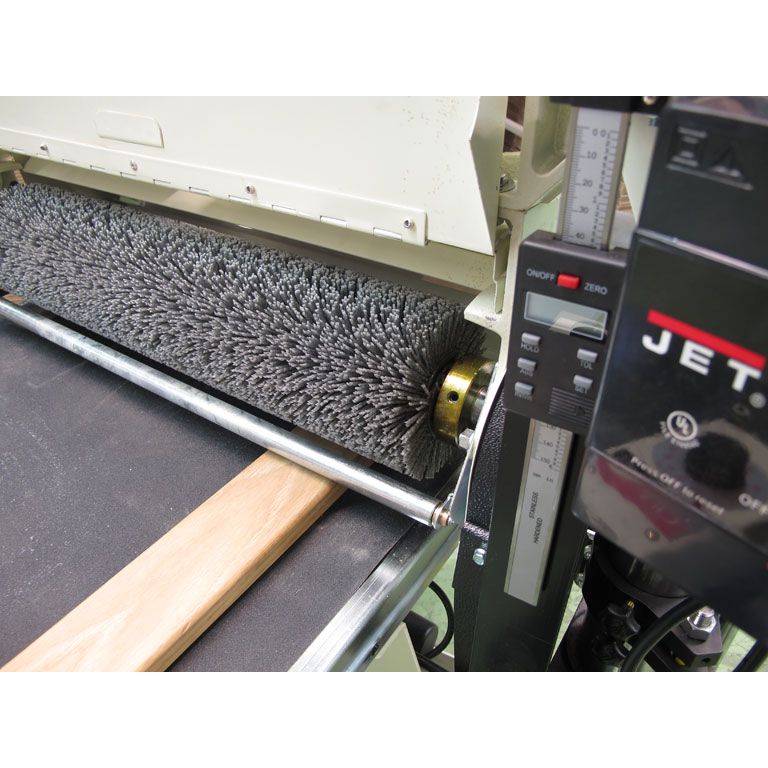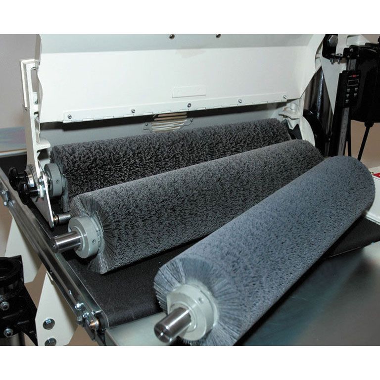 Рабочий инструмент станка – щеточный вал диаметром 127 мм и длиной 515 мм – расположен консольно, что позволяет шлифовать заготовки шириной до метра. Подача осуществляется транспортерной лентой, скорость бесступенчато регулируется в диапазоне от 0 до 3 м/мин. Потребляемая мощность основного двигателя – 3,5 кВт. Консоль с валом перемещается вверх-вниз при помощи штурвала, что позволяет настраивать станок под детали высотой от 2 до 100 мм; контроль производят по цифровому ЖК-индикатору. Входящий в комплект поставки полимерно-абразивный вал с зерном 80G, можно заменить на полимерно-абразивные валы с зерном 120G и 240G или на металлическую щетку с толщиной проволоки 0,5 мм – они продаются отдельно.