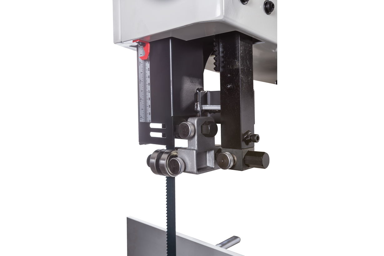 Jet JWBS-18 – новая ленточная пила для профессионального применения. Ее основное преимущество на фоне аналогов прошлых поколений – увеличенная высота распиловки. Этот параметр очень важен для тех, кому нужен универсальный станок, способный взять на себя функции делительного. К подобным работам приспособлен и параллельный упор: направляющий профиль можно установить вертикально на боковую грань так, чтобы надежно фиксировать плоские заготовки при их роспуске на тонкие пластины. В целом конструкция бокового упора очень хорошо проработана и соответствует самым строгим требованиям: профиль жесткий и прочный, закреплен на массивном чугунном кронштейне, который перемещается по цилиндрической направляющей. Предусмотрена грубая (вручную) и точная (микрометрическим винтом) установка.