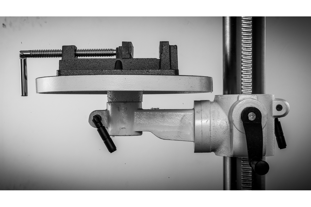Массивный чугунный стол круглой формы имеет радиальные прорези для установки тисков (поставляются в комплекте) и может вращаться вокруг своей оси. Поворотный кронштейн обеспечивает наклон в обе стороны для сверления под углом и регулируется по высоте при помощи зубчато-реечного механизма. Рабочая область с прорезями есть и на основании станка, что позволяет работать от него, в этом случае расстояние до шпинделя будет достигать 1244 мм. Колонна, кронштейны, стол и прочие образующие конструкцию детали выполнены массивно и прочно, с расчетом на большие усилия при подаче сверла.