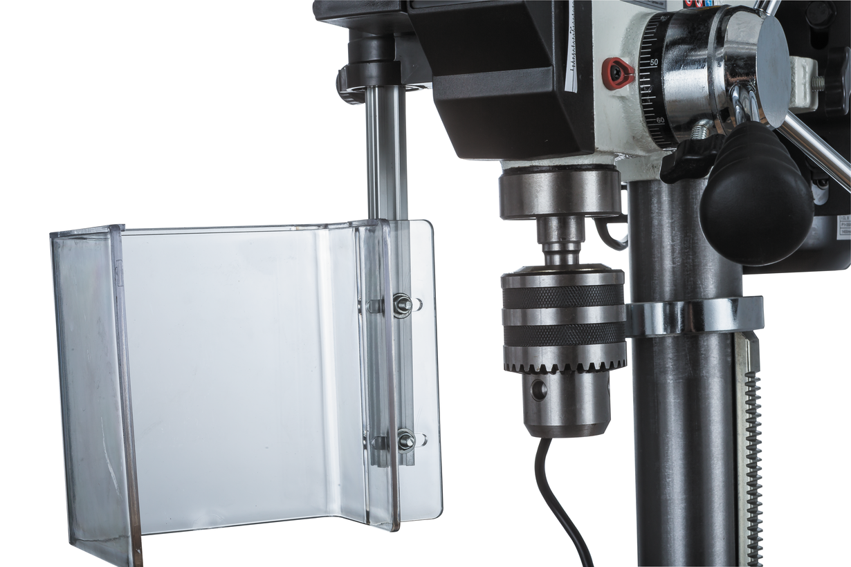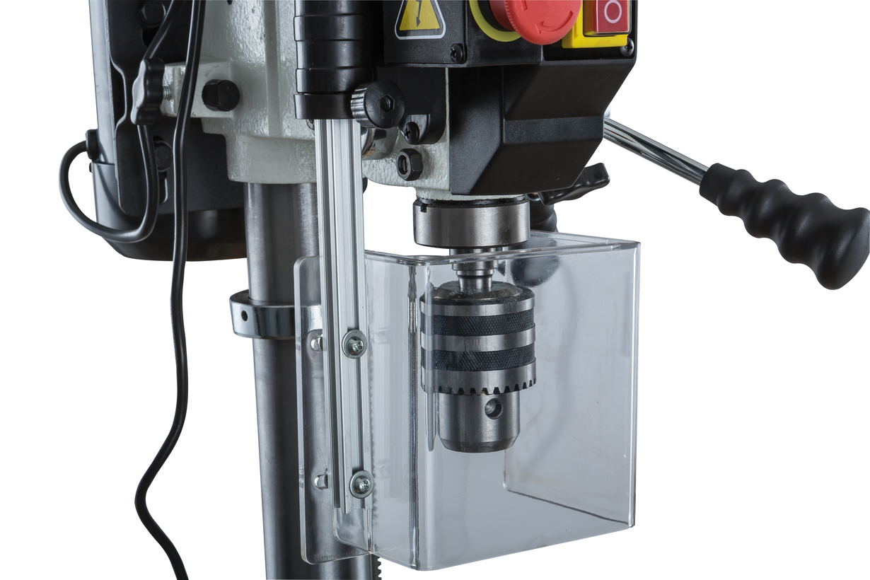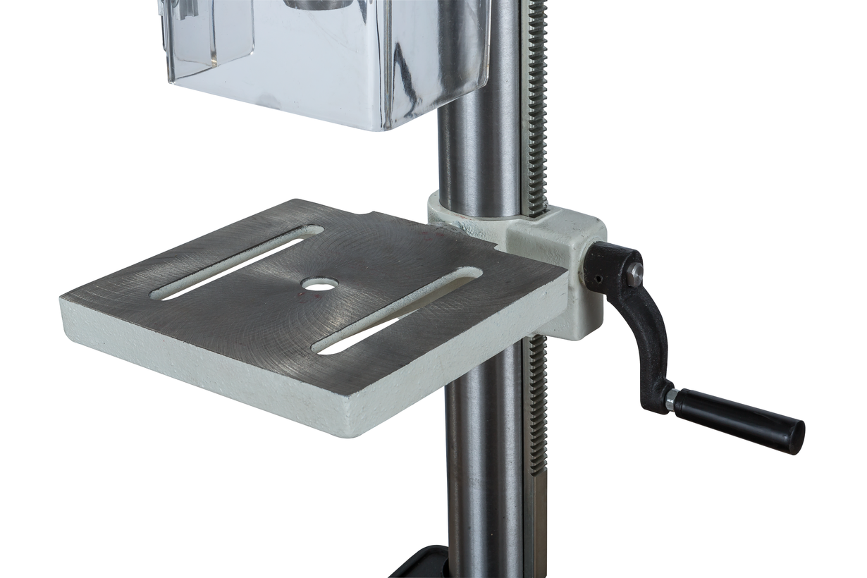 Рукоятка привода пиноли оборудована лимбом для контроля подачи и имеет встроенный ограничитель хода (глубины сверления). В штатный комплект поставки входят станочные тиски Wilton, для крепления которых предусмотрены пазы на столе и на опорном основании станка.
