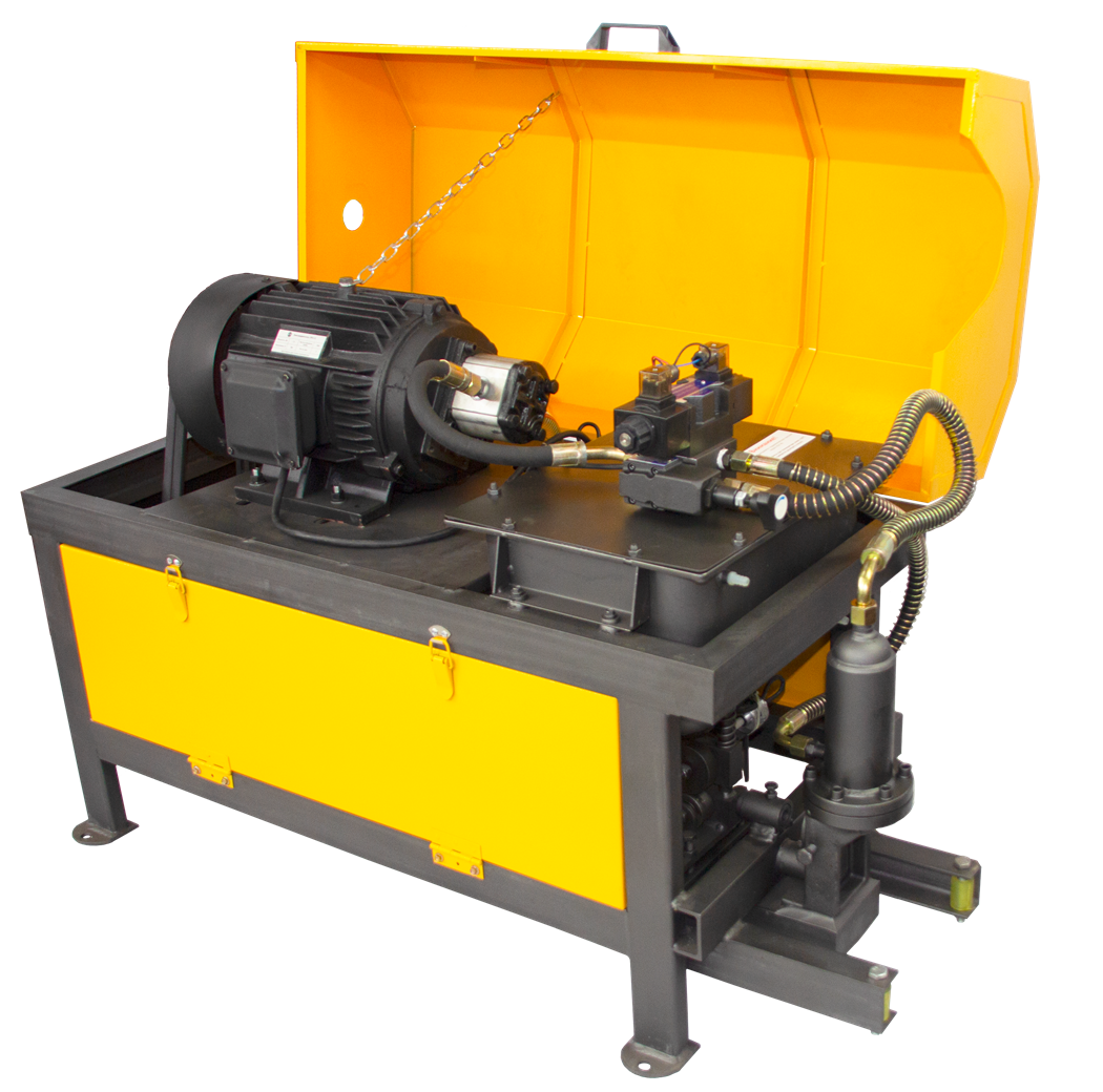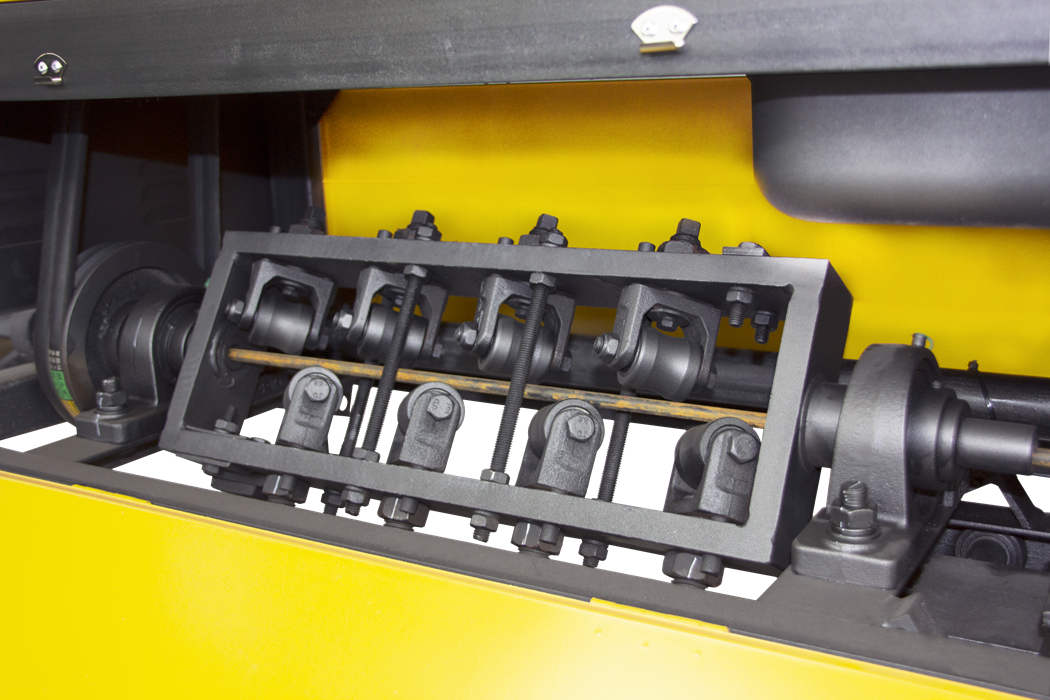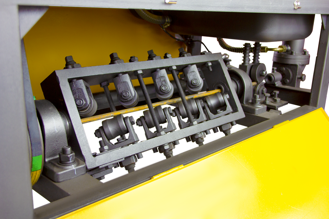 Электродвигатель через шкив и ремни передает вращение на выпрямляющую раму, которая одновременно выполняет функции подачи и выпрямления арматуры. Выпрямление происходит за счет давления обкатных роликов на арматуру. Резку осуществляет нож при помощи гидропривода, давление в гидроприводе создается масляным насосом.