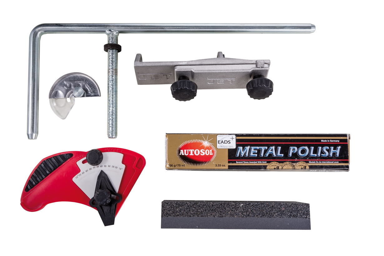 Станок укомплектован кронштейнами-направляющими для работы с использованием вспомогательных приспособлений, большой ассортимент которых представлен под маркой Jet и поставляется штатно или за дополнительную плату.
