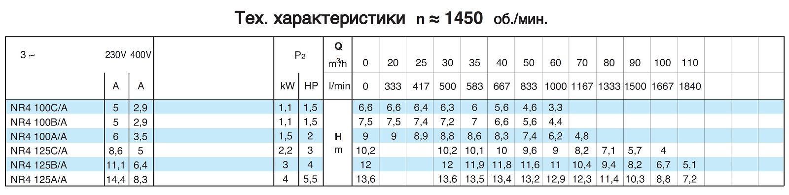 Насосные агрегаты NR4 - центробежные с одним рабочим колесом типа "IN - LINE" с четырехполюсным электродвигателем (n = 1450 об./мин.). Проточная часть насоса, рабочие колеса и присоединительные фланцы выполнены из чугуна.