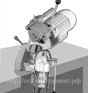 Она состоит из корпуса, внутри которого на шариковых подшипниках вращается вал. На одном его конце с помощью фланцев и гайки закрепляется абразивный круг, а на другом — крыльчатка вентилятора. К корпусу головки крепится фланцевый двигатель, приводящий в движение вал с кругом и крыльчаткой вентилятора через эластичное кольцо и втулку. На качающейся рамке имеется микрометрический винт с нониусом, который упирается в площадку на станине станка и ограничивает ход в зависимости от типа затачиваемой пильной цепи. Опускание головки (надвигание) при заточке пильной цепи выполняется вручную, а возврат ее в исходное положение посредством пружины. Натяжение пружины регулируется винтом.